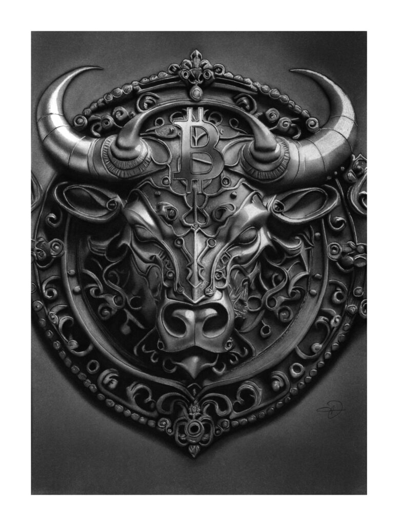 ‘Bullish’ encapsulates the crypto narrative. Aggressive. Focussed. A nod to the future of money, Bitcoin. ‘Bullish’ is a hand-drawn, hyper-realism Original artwork by Dullal Miah, taking 90 hours to create.